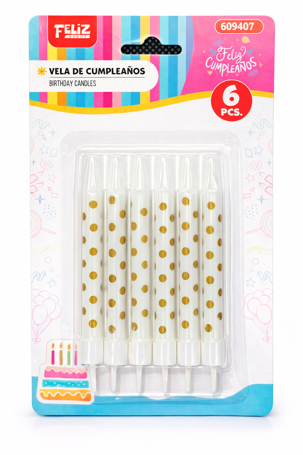 Este set incluye 6 velas espirales, ideales para decorar pasteles de diferentes tamaños. Su diseño atemporal combina con cualquier temática o decoración.