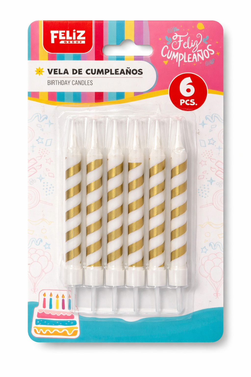 Descubre nuestras velas espirales blanco y dorado, el detalle perfecto para realzar la elegancia de tus fiestas y cumpleaños. Este set de 6 unidades combina diseño moderno con colores clásicos, adaptándose a cualquier temática de decoración.