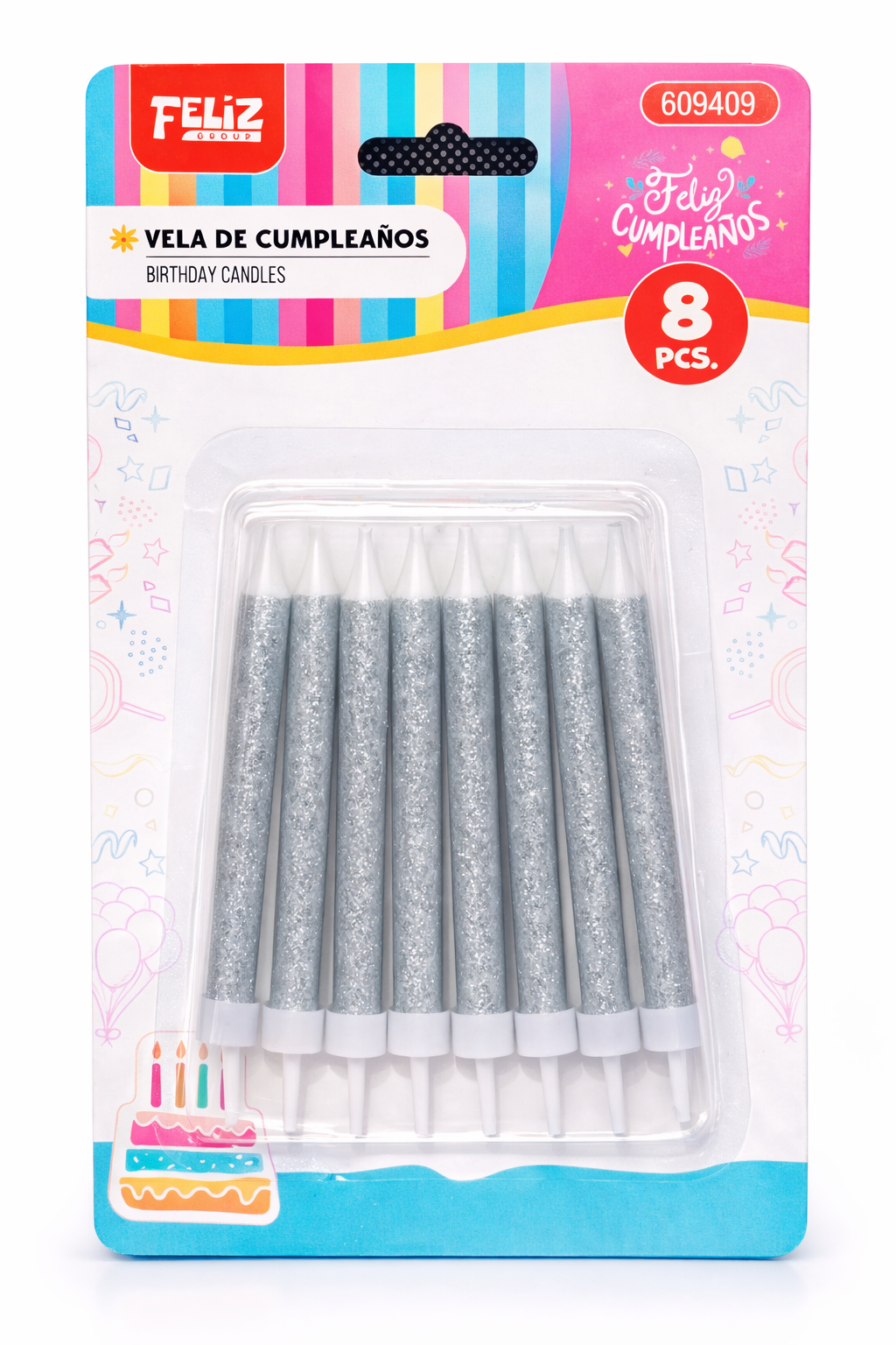Nuestro paquete incluye 8 velas elaboradas con acabados de glitter plateado de alta calidad. Su diseño moderno y llamativo las convierte en la elección ideal para decorar tartas y mesas, garantizando un impacto visual que encantará a tus invitados.