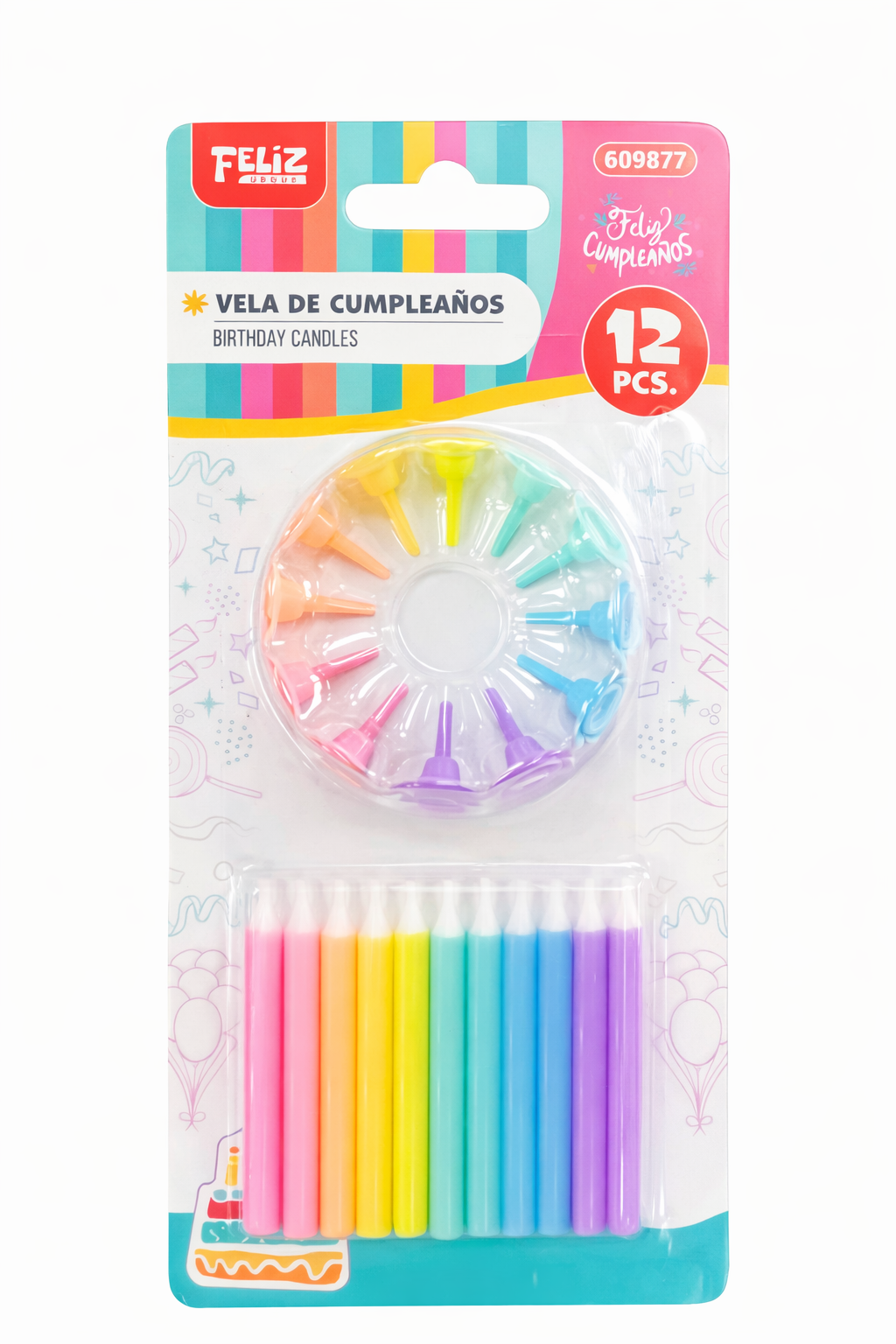 Transforma cualquier pastel en una pieza central inolvidable con nuestro set de 12 velas pastel. Estas velas están diseñadas para añadir un toque vibrante y encantador a tus celebraciones.