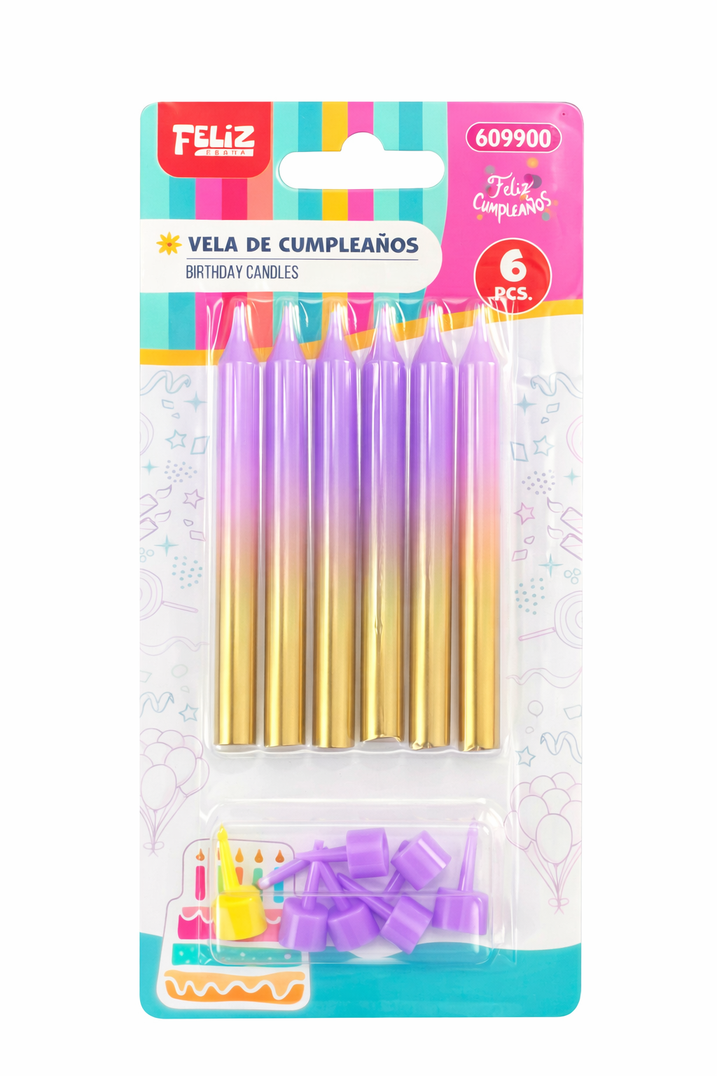 Este set incluye 6 velas cuidadosamente creadas para transformar cualquier pastel en una obra de arte. Su color oro morado combina modernidad y lujo, haciendo de ellos un detalle imprescindible en tus celebraciones.